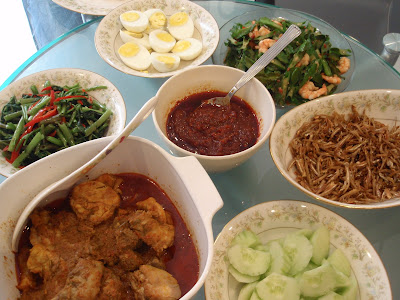 The main dish was Chicken Rendang. The spices that went into this dish were shallots, garlic, dried chillies, ginger, lengkuas, kunyit and kunyit leaves. All these were pounded/blended and cooked with fresh coconut milk.