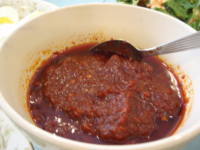 The standard accompaniment to Nasi Lemak are of course boiled eggs, fried anchovies (ikan bilis), cucumber and the crucial Sambal:
