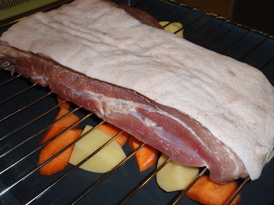 Before roasting I stabbed the pork skin as much as possible – so much so that the fork I used had bent! If you have a skewer, that would be a better tool. Warning: Poking raw pork skin is really hard work!!