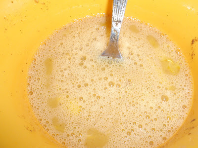 3. Move the shrimps & fishcake to the side of the wok, put in another tbsp oil and pour in the beaten egg. Stir and fry eggs till it’s almost cooked, then toss in the yellow noodles.